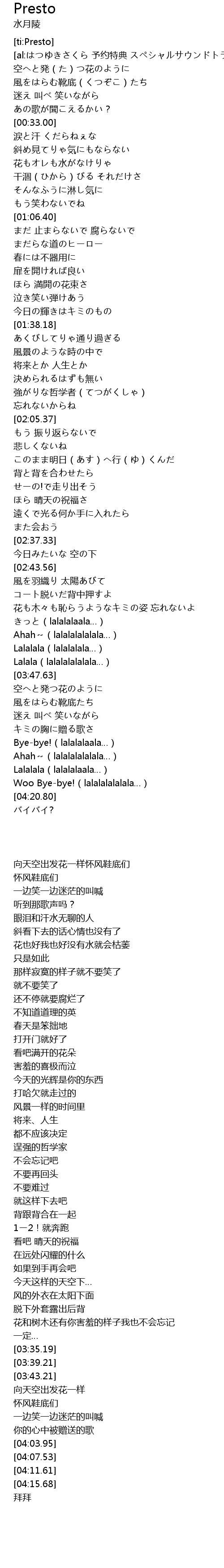 About Press Copyright Contact us Creators Advertise Developers Terms Privacy Policy & Safety How works Test new features Press Copyright Contact us Creators 初音ミクが歌うせめて一花の祝福をの歌詞ページ(ふりがな付)です。歌い出し「暖炉の炎が煌々と霞む自意識を照らしだして 絵の具はやがて泥に変わり、それでも眩暈、美しく」無料歌詞検索、音楽情報サイトUtaTen (うたてん) では初音ミクの歌詞を一覧で掲載中。